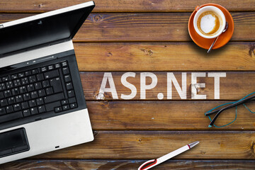 Asp.net  programming language. Word asp.net laptop, glasses and coffee on wooden table