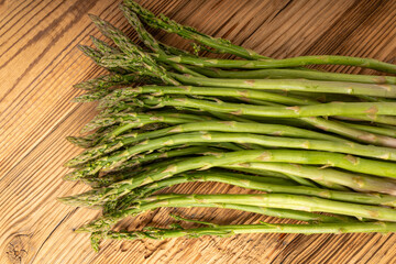 Bunch of Raw Garden Asparagus on Wood Rustic Tabletop. Fresh Green Spring Vegetables