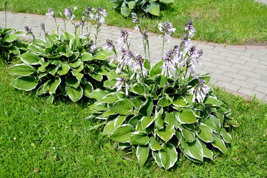 Flowering of the plant Host (Funkia) of the "Francee" variety in the city square