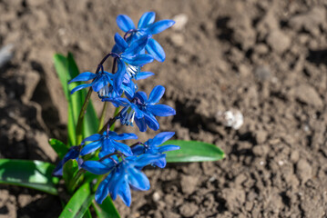 Bright sunny day reveals purple blue siberian squill in early spring bloom, natural growth