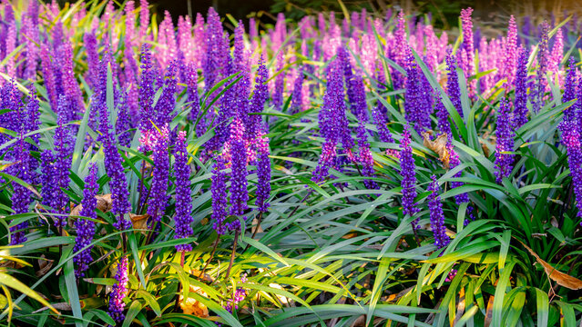 Selective focus of blue Lily turf flower in the garden, Liriope muscari is a species of flowering plant from East Asia, Herbaceous perennial has grass-like evergreen foliage, Nature floral background.