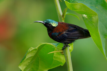 Black sunbird Leptocoma aspasia bird in Nectariniidae, eastern Indonesia and New Guinea in subtropical or tropical moist lowland and mangrove sforest, Feeds on nectar, green background