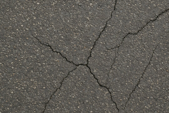 Close up of dark grey asphalt with multiple fine cracks and gravel texture