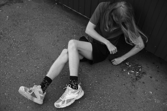 Young man with long hair sits on the asphalt