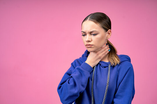Portrait of a woman on a pink background, holds a hand near the throat, pain and sore angina, suffocation signs of a cold, flu illness