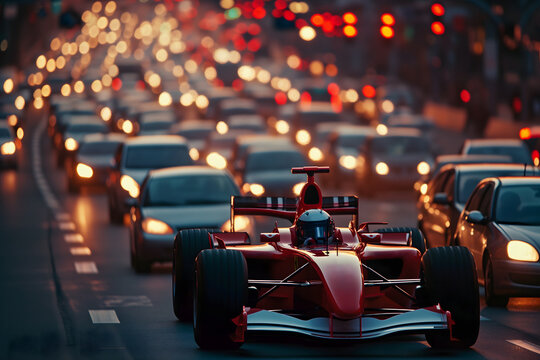 Formula 1 car stuck in traffic at the rush hour on the road of a capital city. Neural network generated image. Not based on any actual scene or pattern.