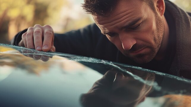 Car with a cracked windshield in a driveway. Featuring a driver assessing the damage