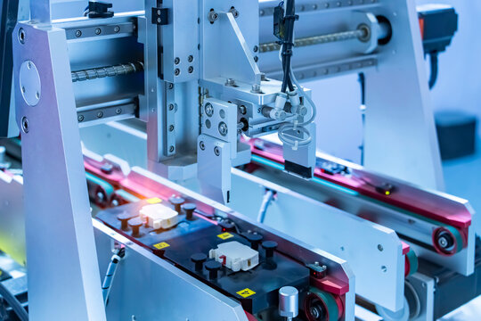 Industrial robotic arms assembling electronic components on a high-tech production line. Automation, manufacturing, robotics, industrial engineering, technology in electronics manufacturing.
