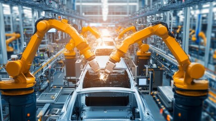 Advanced robotic arms in a modern car manufacturing plant assembling vehicle components with precision automation, showcasing futuristic industrial robotics and high-tech automotive production line te