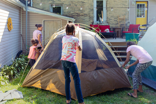 Close up detail of camping tent. Aluminum tent poles. Process of installing tent, setting up tent outdoors.