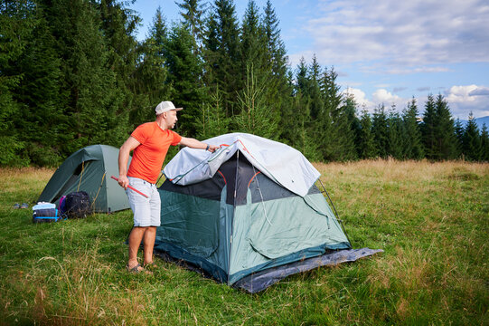 Man hiker set up tourist tent on grassy hillside. Pine trees and distant mountains under partly cloudy sky.
