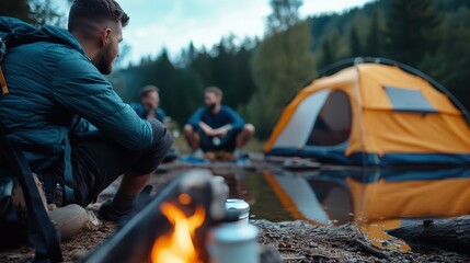 Couple cooking over campfire beside yellow dome tent in remote rocky wilderness landscape