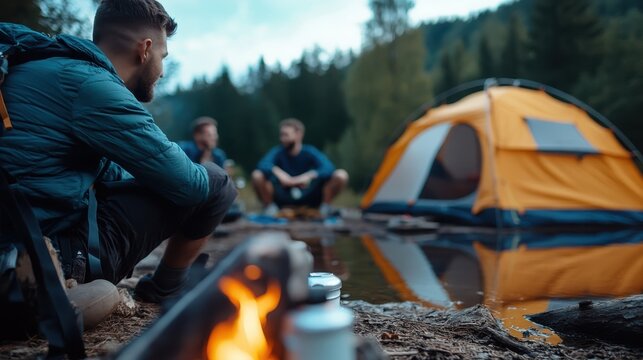 vertical portrait Smiling young man with hat assembling tent poles at campground during summer sunset