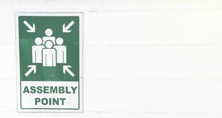 Emergency assembly point sign at factory showing safety instruction for evacuation protocol and workplace emergency preparedness