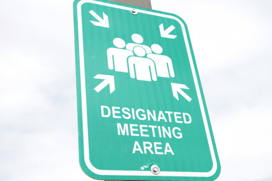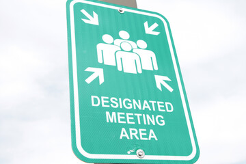 designated meeting area vertical rectangle green and white sign on post with sky behind, illustration of people with four arrows pointing at them