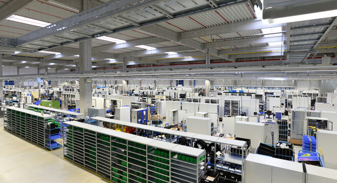 modern industrial hall - production site of a factory for the assembly of electrical equipment in switchgear cabinets in mechanical engineering - machinery and equipment at the workplace