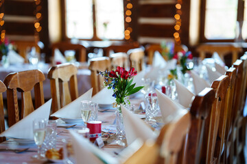 Elegantly set wedding table with flower decorations, champagne glasses, and folded napkins in a cozy wooden interior with warm fairy lights.