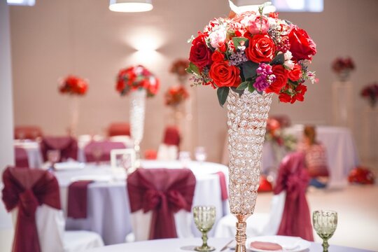 Elegant Event Venue with Luxurious Floral Centerpieces and Candlelit Ambiance