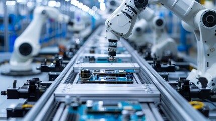 Welding chrome robotic arms producing sparks in futuristic industrial hangar 2026 floor