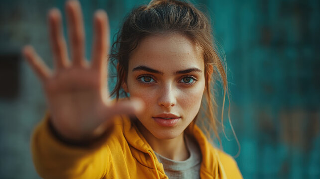Focused Gesture: A person, with outstretched palm and raised fingers, exudes an aura of intent, commanding attention and setting boundaries.