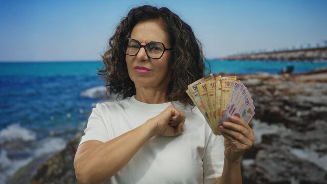 Middle aged hispanic woman holds mexican peso banknotes while extending fist to camera on beach; assertion empowerment.