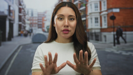 Woman showing open palm and clenched fists with hands forward wearing gray hoodie in busy airport terminal near gate sign; playful confidence.
