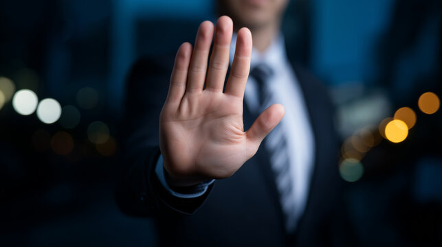 Businessman raising his hand in a stop gesture symbolizing refusal, control, and decision making.