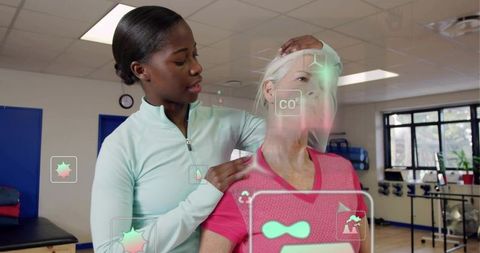 Physical therapist assessing senior neck mobility with augmented reality in rehab gym