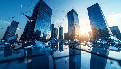 Digital financial data overlapping urban office buildings