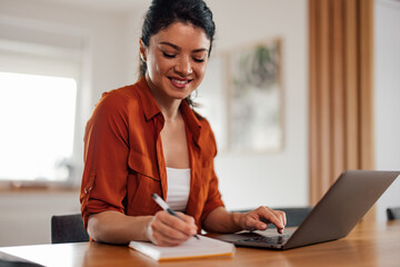 Smiling caucasian woman, browsing the internet, writing in her notebook.