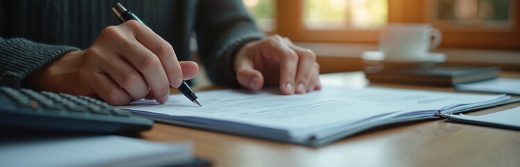 A close-up of a hand signing a document with a pen on a wooden desk, symbolizing business agreements and legal processes.