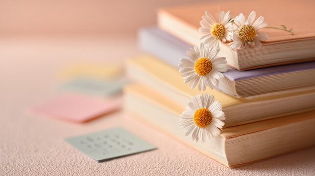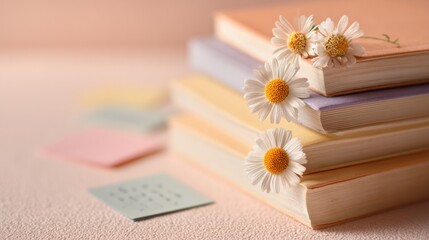 Stack of books adorned with daisies and colorful sticky notes on a pastel background