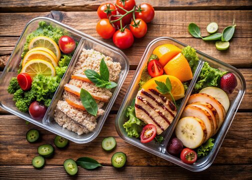 Freshly prepared healthy meal prep containers filled with nutritious quinoa, grilled chicken, steamed vegetables, and sliced fruits, arranged on a rustic wooden table.