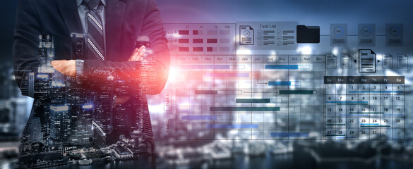 A businessman stands confidently in front of a vibrant cityscape at night, surrounded by digital charts and data, symbolizing corporate success and technological growth. Gantry