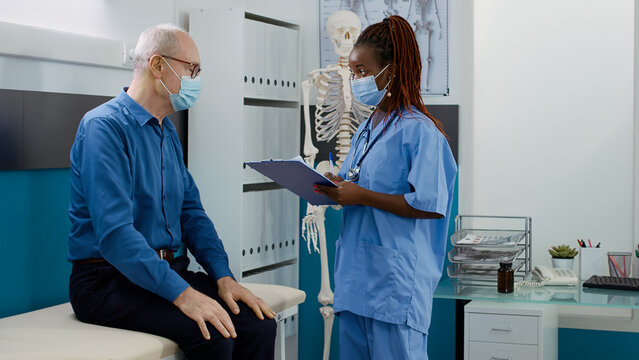 Medical assistant doing checkup consultation with old man, examining patient with disease to give medical support and treatment. Female nurse consulting person at healthcare appointment.