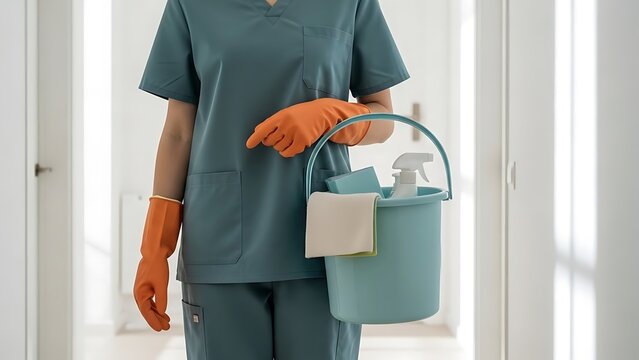 Cleaning worker holding a bucket with cleaning supplies, ready to clean a room and maintain hygiene