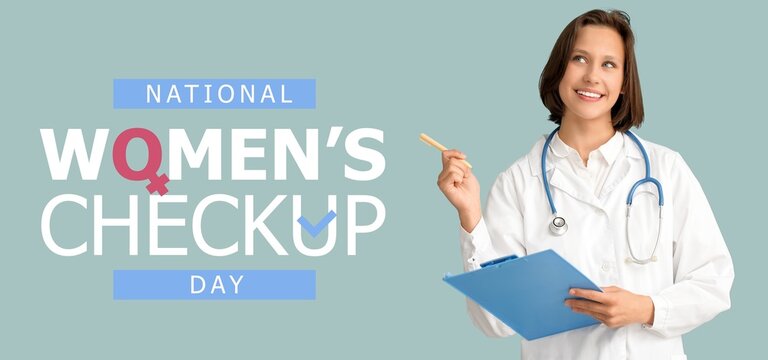 Happy female doctor on light blue background. Banner for National Women's Checkup Day