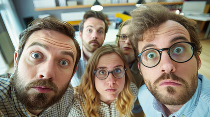 A group of funny, friendly, and happy managers standing together, exuding positivity and teamwork
