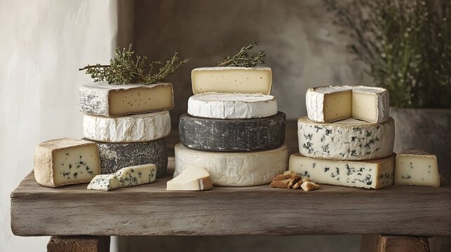 Assorted Gourmet Cheeses Arranged On Rustic Wooden Table