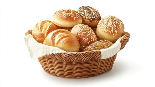 A basket of assorted bread rolls, bakery collection, realistic style, variety of textures, isolated on white background