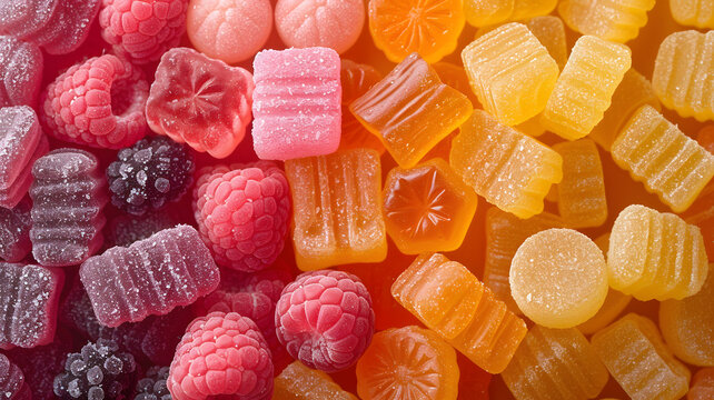 candies with jelly and sugar. colorful array of different childs sweets and treats.