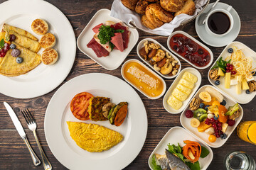 A set of various cheeses, smoked sausage, apricot orange sauce, walnuts, blood sausage and fried bread on a marble board and a wooden table.
