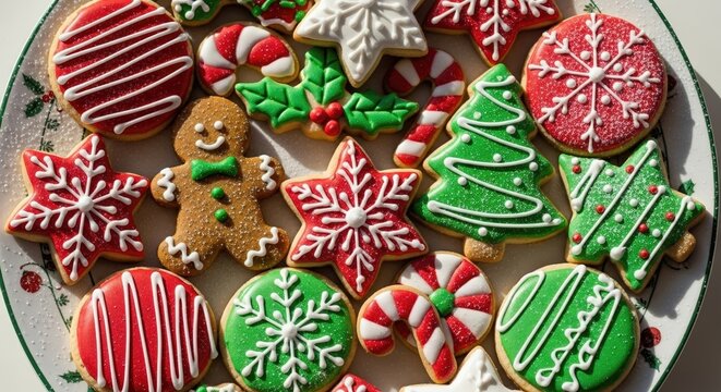 A festive plate of assorted Christmas cookies decorated with colorful royal icing in various holiday shapes.