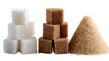 Three Piles of Sugar, White and Brown, in Cube, Diamond, and Hexagonal Shapes on Transparent Background