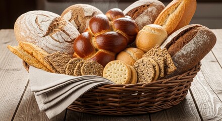 Artisan Breads in Basket: An assortment of freshly baked, golden artisan breads and savory crackers artfully arranged in a rustic woven basket, showcasing a delicious display of textures.