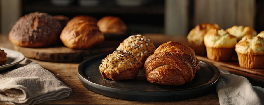 Freshly baked assorted bread and muffins on rustic wooden table, showcasing variety of textures and colors. warm tones evoke cozy atmosphere perfect for enjoying baked goods