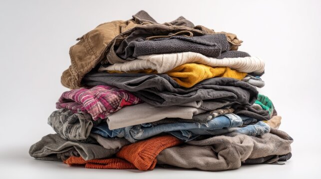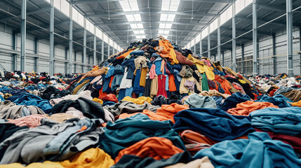 Heap of various textiles and clothing piled up in a recycling center, raising awareness about the environmental issues caused by textile waste