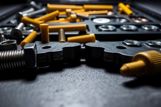 Above view of used greasy old dirty car repair mechanic hand tool set kit vehicle repair and maintencae service. Hardware toolkit with many different garage equipment. Automobile fix background