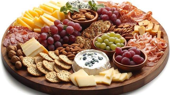 Delicious charcuterie board with assorted meats, cheeses, crackers, olives, nuts, and grapes on rustic wooden surface, perfect for party, entertaining, and gourmet food content