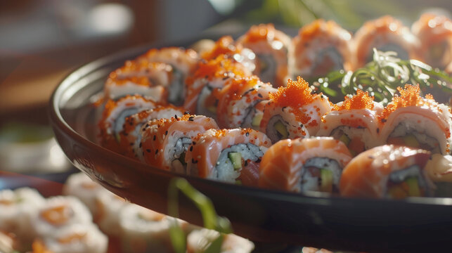 Closeup of assorted sushi rolls with roe on a plate